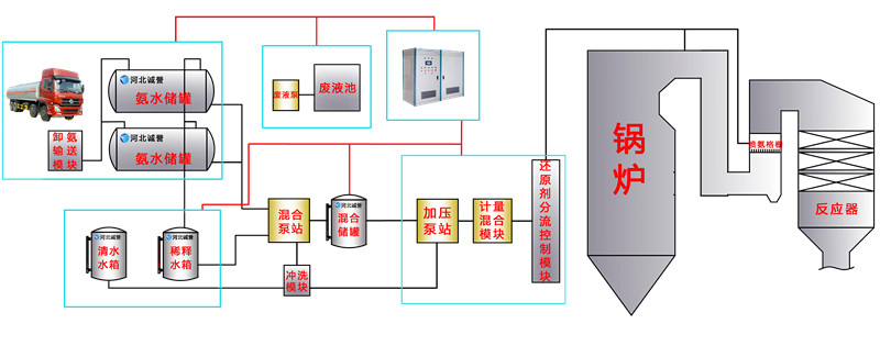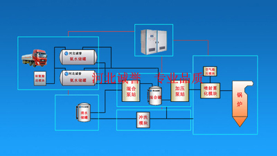 液體罐車運送濃度20%-30%的氨水至水泥廠,泵送到儲存罐中供脫硝使用。脫硝時,氨水經泵站加壓稀釋后,通過管道輸送到脫硝噴槍的脫硝噴頭內,氨水溶液經過脫硝噴頭霧化后直接噴入水泥窯尾分解爐內,氨氣與NOX反應后生成氮氣直接排..