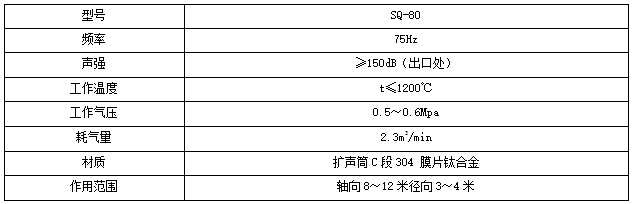 由于需依托聲響能量使反響器內塵土顆粒發生振動而清灰,有必要選用特定頻率的某些聲強,較低的頻率意味著有更大的清潔區域,具有更低頻率的聲波清灰設備可提供更大的有用清灰規劃。具體參數如下: