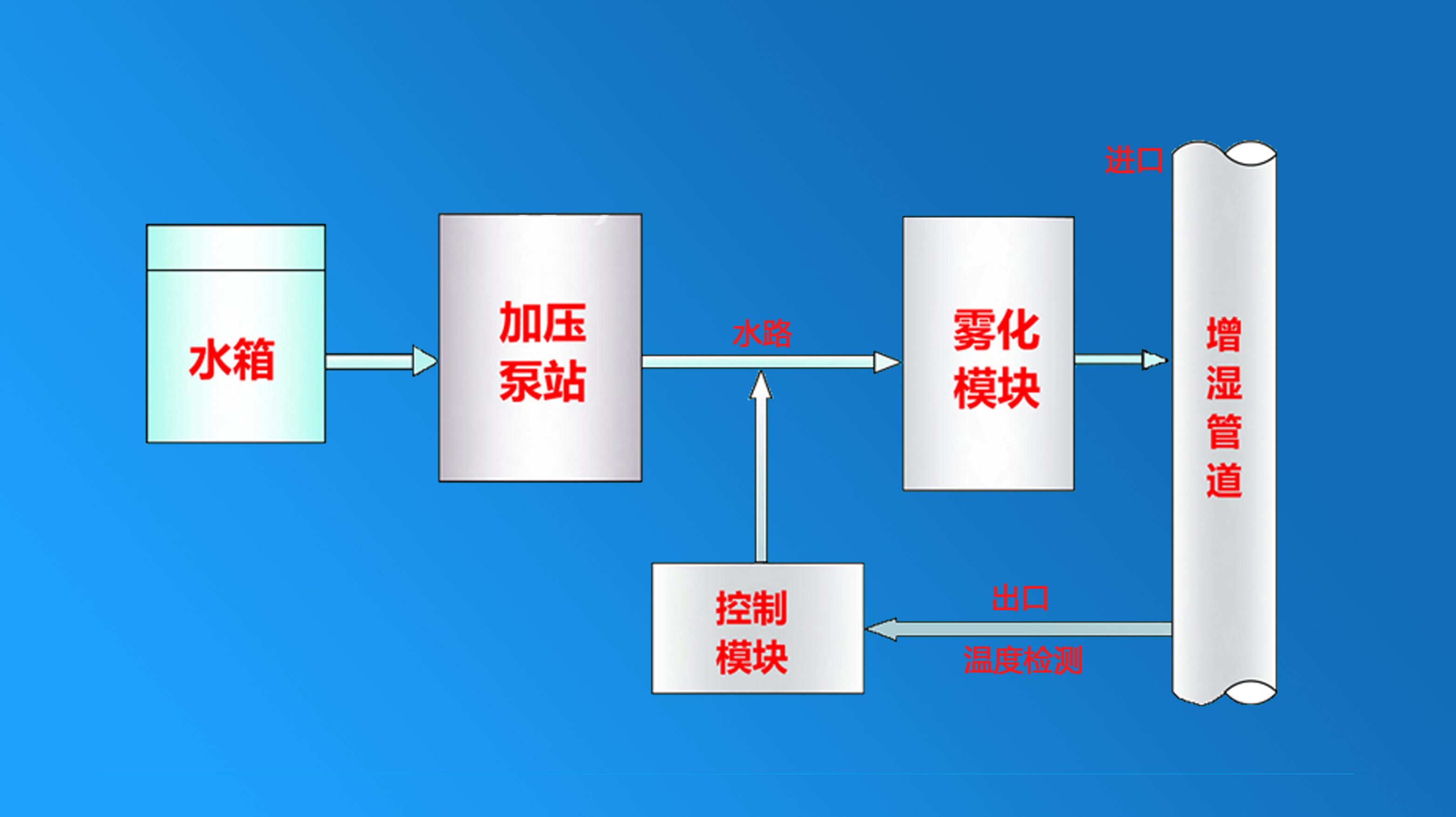 系統(tǒng)結(jié)構(gòu):該系統(tǒng)霧化噴槍固定在增濕塔錐體部位,整套設(shè)備由四部分構(gòu)成:一是壓縮空氣供應(yīng)系統(tǒng),與主排風(fēng)機(jī)相連接;二是加壓供水系統(tǒng)。由立式多級離心泵帶電機(jī)和整套精密低壓閥門、過濾器等附件組成;三是增濕塔頂部霧化系統(tǒng)。由增濕塔頂部環(huán)管、噴槍、噴嘴、高壓伸縮軟管及精密閥門、過濾器等連接件組成。四是多功能控制系統(tǒng)。由氣、水壓力、溫度、流量測控器,低壓元器件和變頻器等組成完整閉路控制系統(tǒng)。